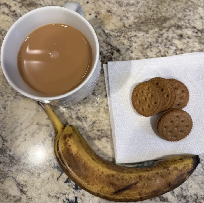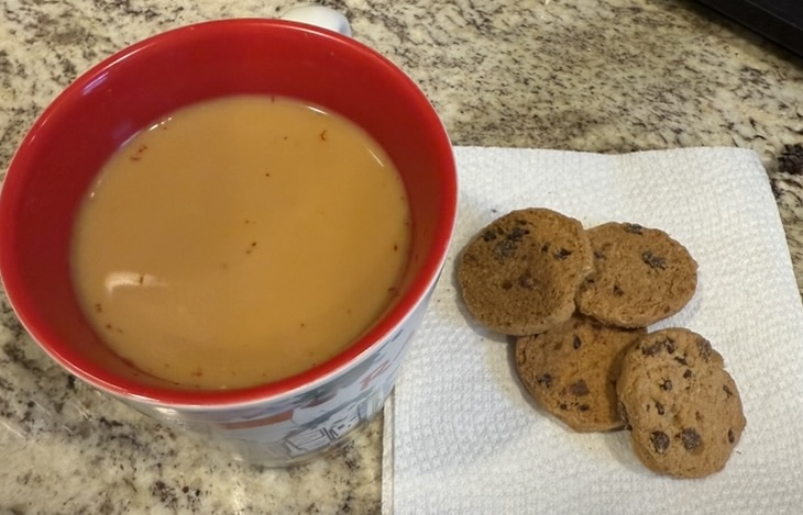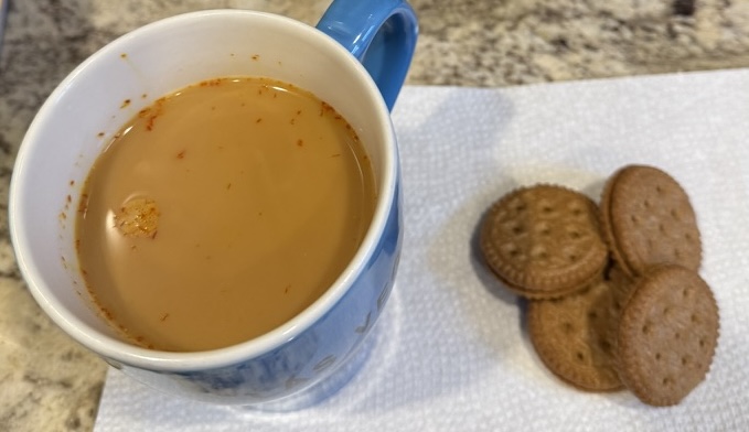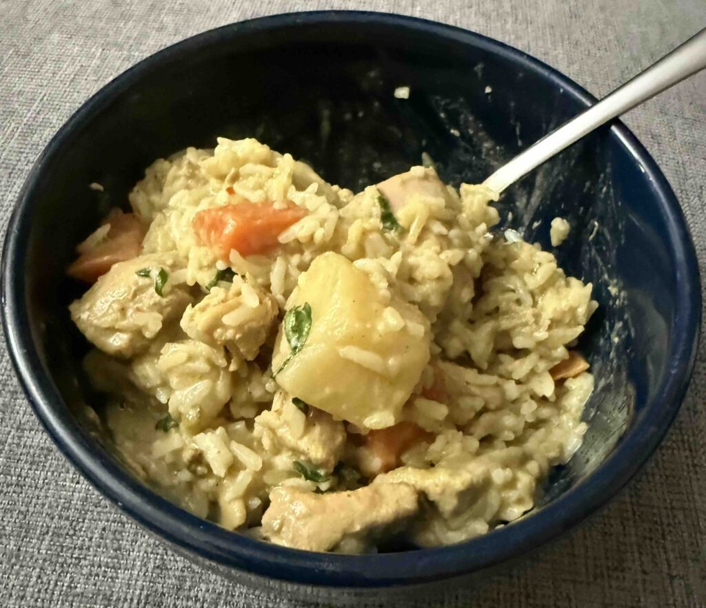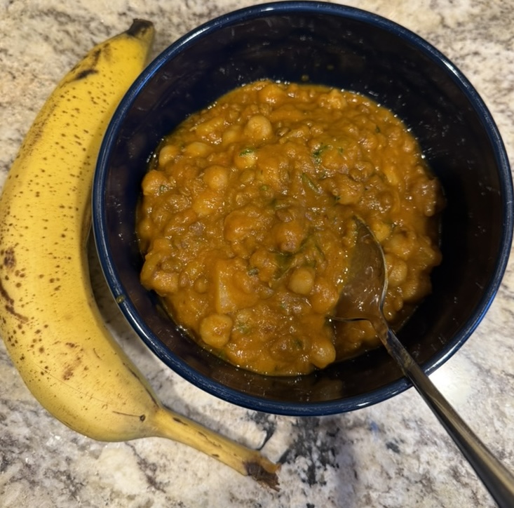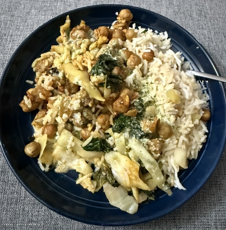Food Day 16 December 30, 2024 Chana masala, veggies, rice Chai, cookies Eggs, orange, coffee Sigaporean chicken curry, rice