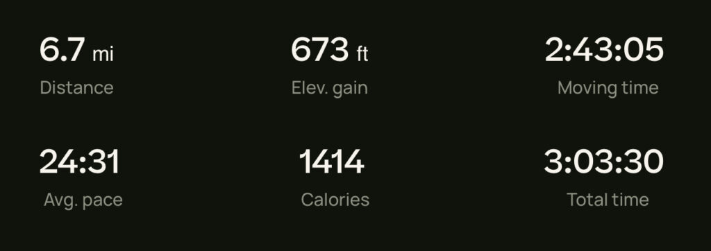 Food Hike Weight Check Day 14 December 28, 2024 Weight Check 298lbs (135.171kg) Hike I doubt the “Calories” stat is accurate. Hike stats Food Sausage and peppers, banana Chai, cookies Chicken veg patties, potatoes, mayo Mochi ice cream