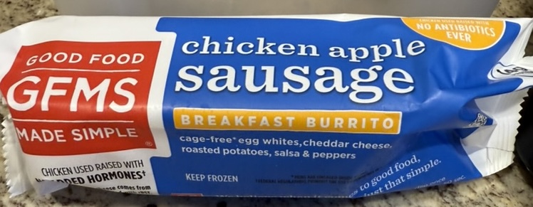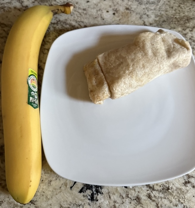 Food Day 44 January 27, 2025 Breakfast burrito, banana Pickle Chicken Salad Apple Almonds Frozen Greek Yogurt