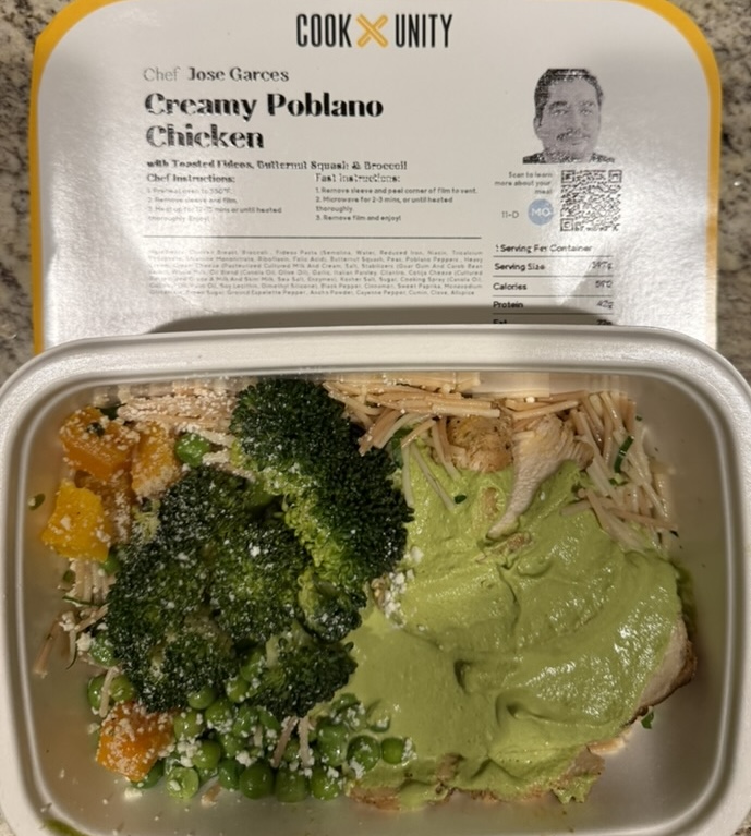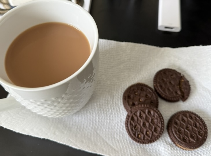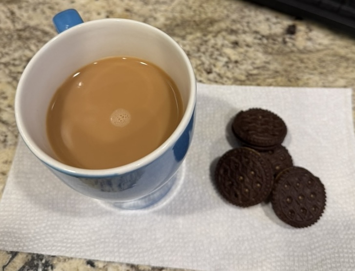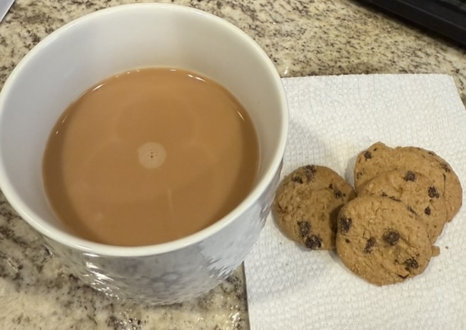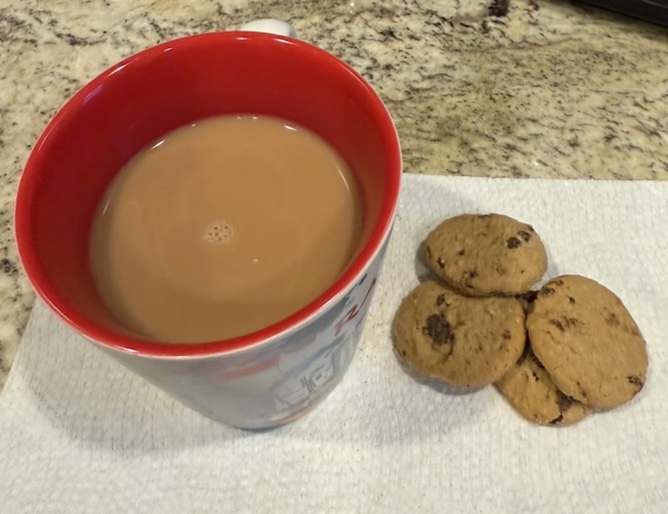 Food Day 46 January 29, 2025 Chai, cookies Salmon salad, orange Creamy poblano chicken Mochi ice cream