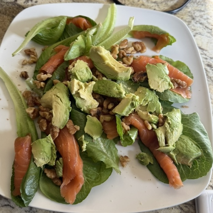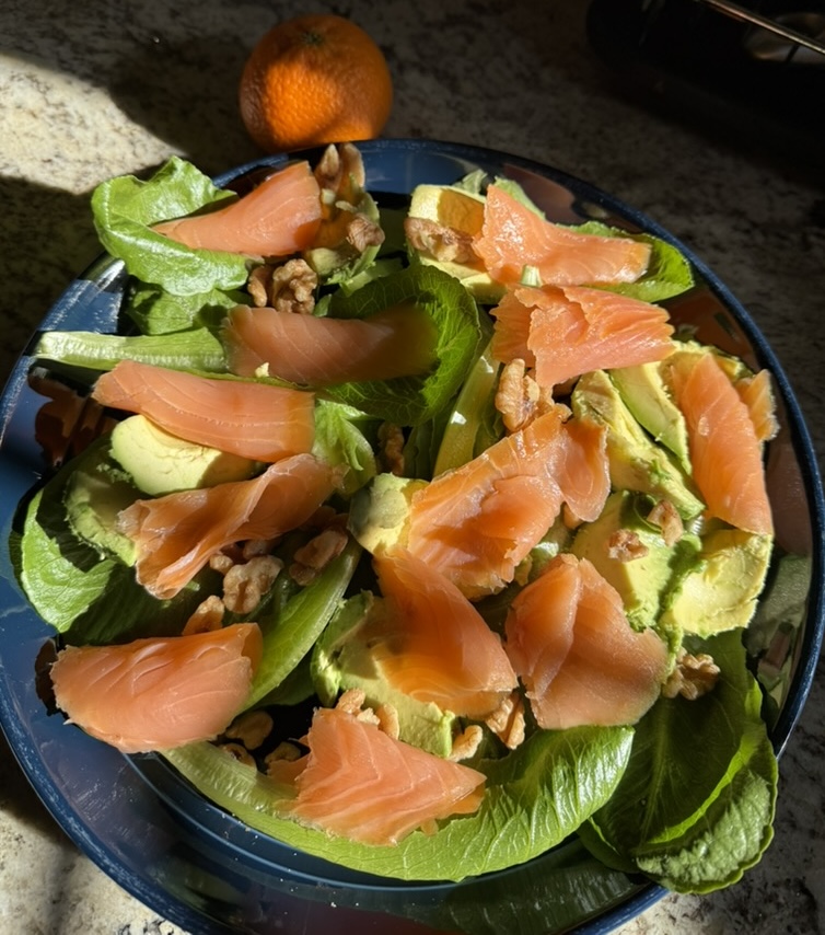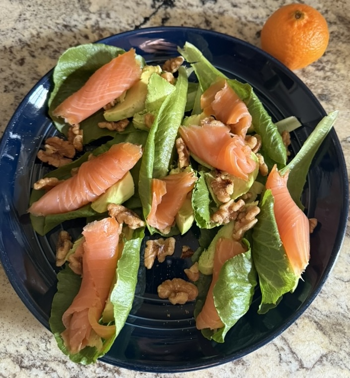 Food Day 45 January 28, 2025 Breakfast burrito Tea and cookies Salmon, walnuts, avocado, lettuce, orange Rice, beans, bacon Mochi ice cream