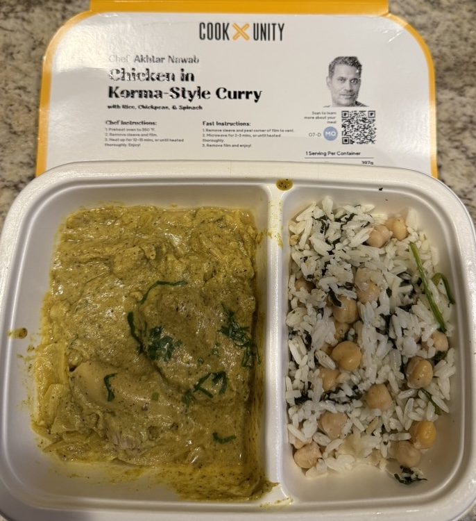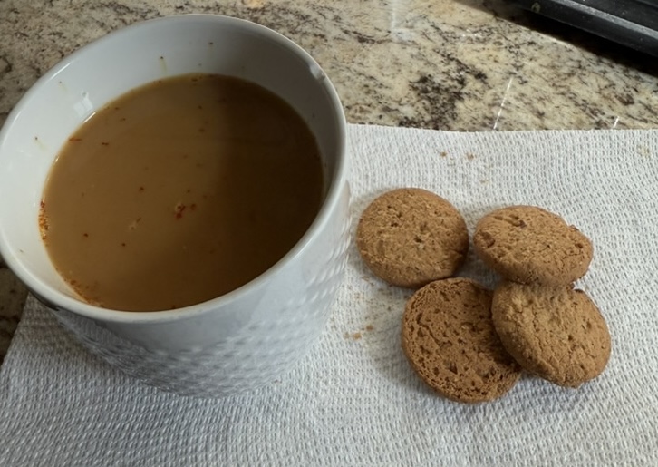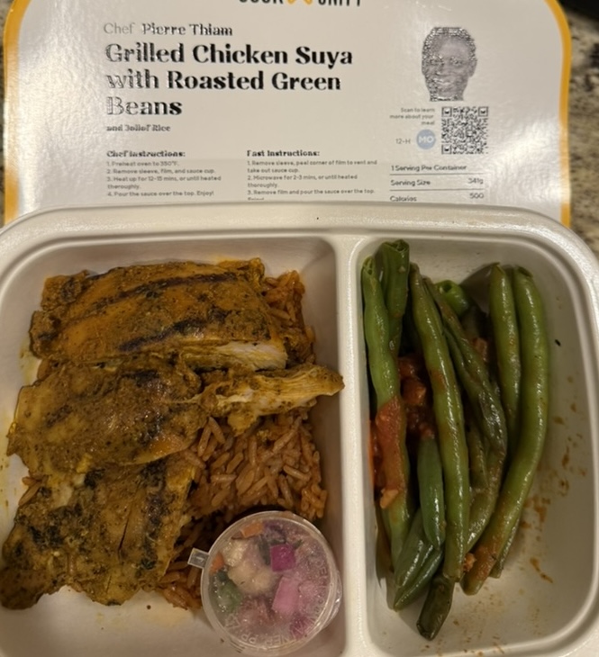 Food Day 43 January 26, 2025 Chicken korma, rice Banana Matcha Latte Chocolate cashew cookies Chicken suya, green beans, jollof rice
