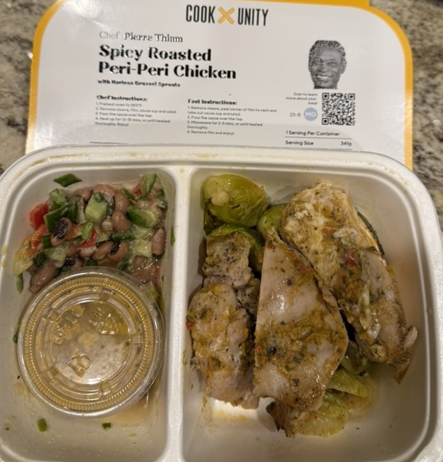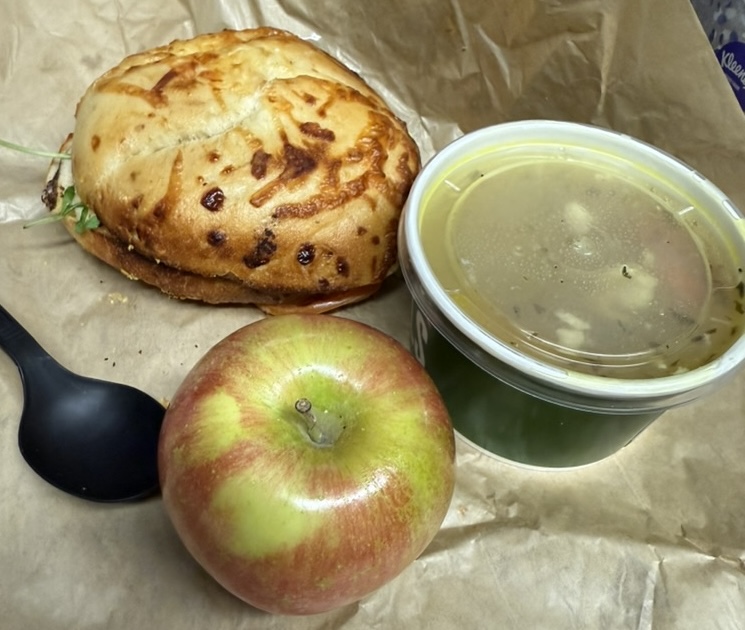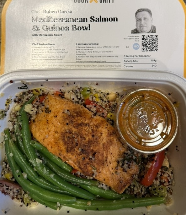 Food Day 41 January 24, 2025 Salmon quinoa bowl Pop chips Chai Chicken sandwich and soup, apple Orange Peri Peri chicken