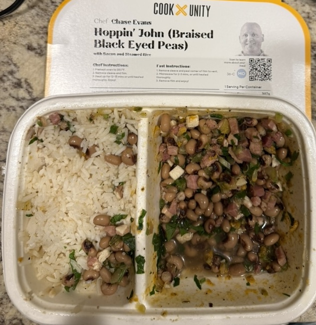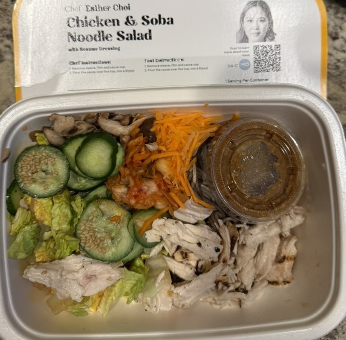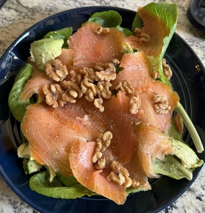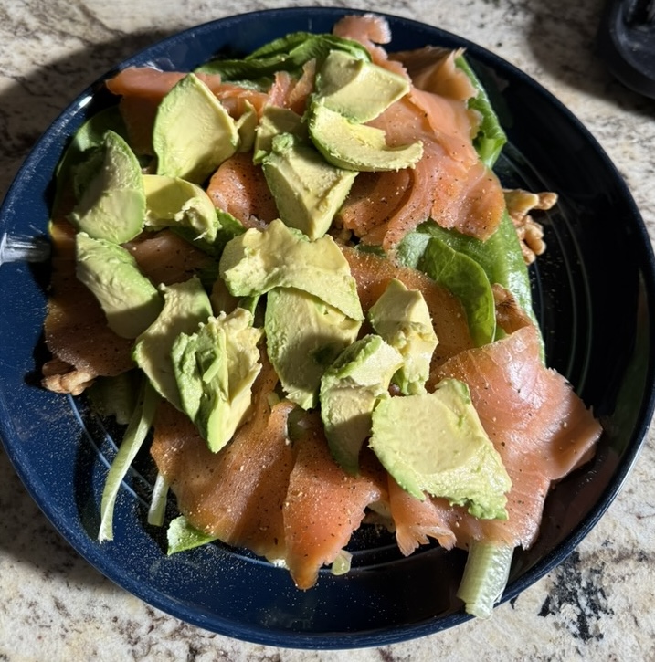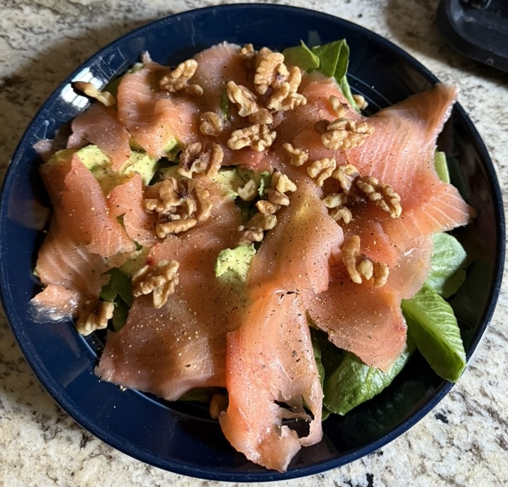 Food Day 34 January 17, 2025 Chicken & soba noddle salad Chai Salmon, walnut, avocado, lettucs Braised black eyed peas Frozen greek yogurt