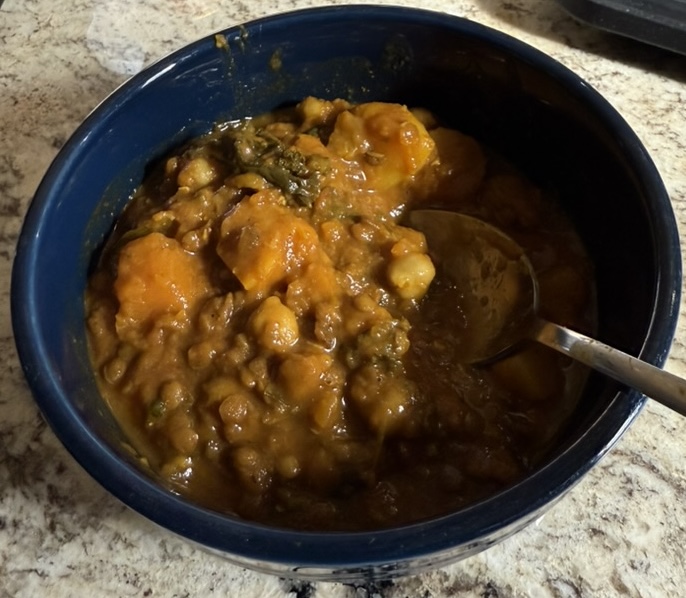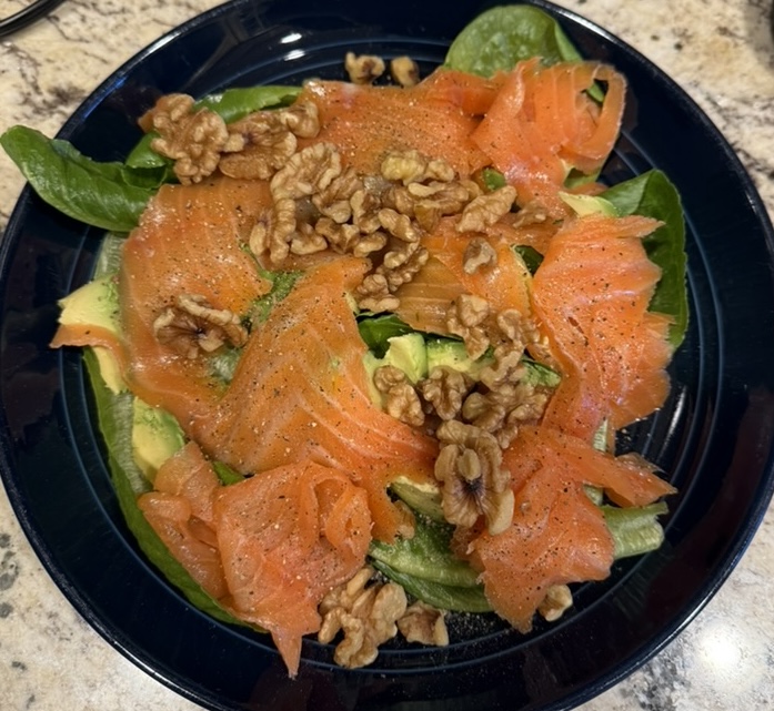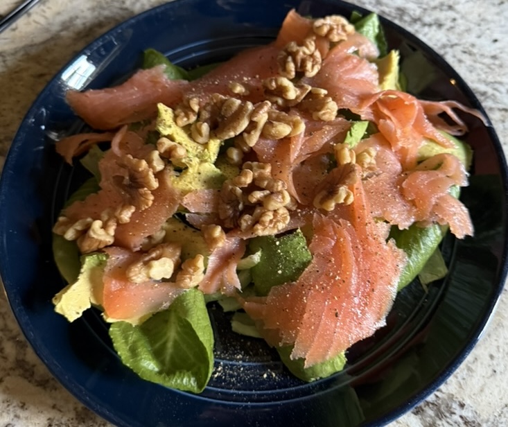 Food Day 33 January 16, 2025 Salmon, walnuts, avocado, lettuce Coffee Chai Banana Lentil chickpea stew Walnuts Turmeric roasted chicken thighs Mochi ice cream