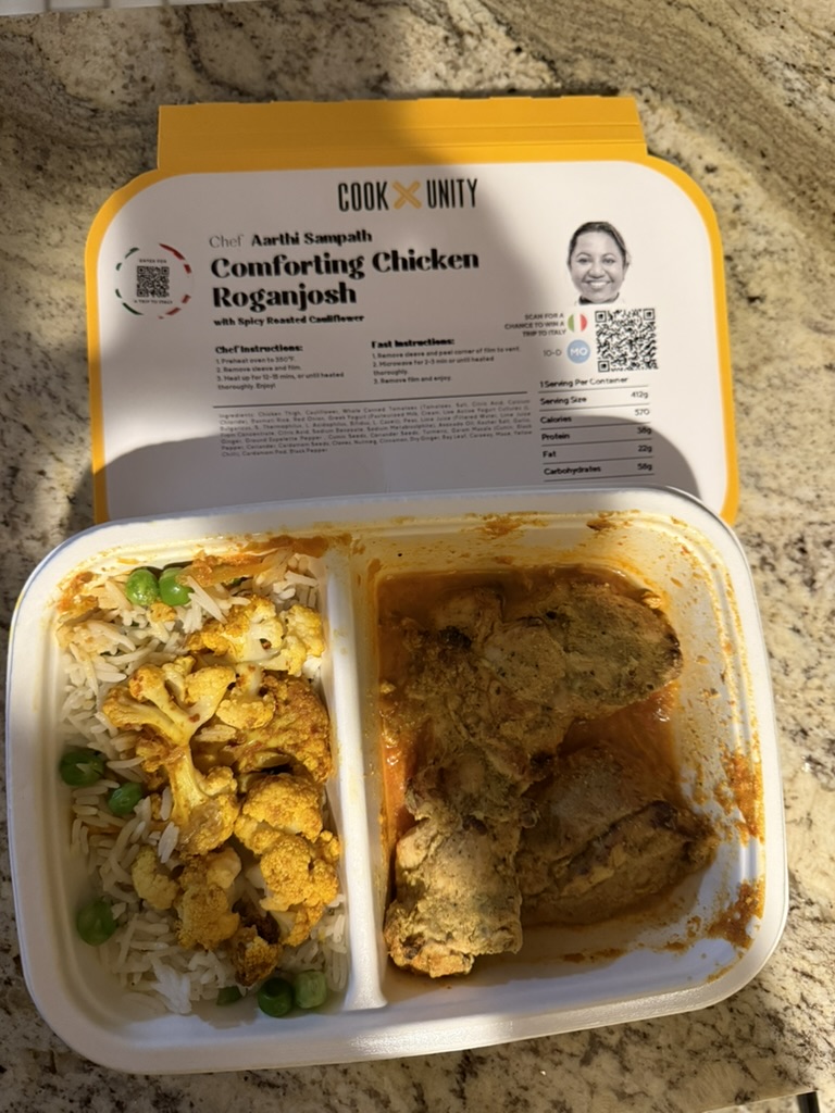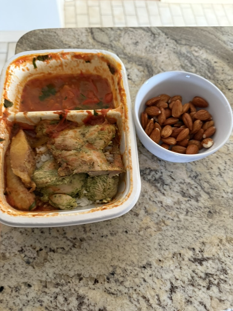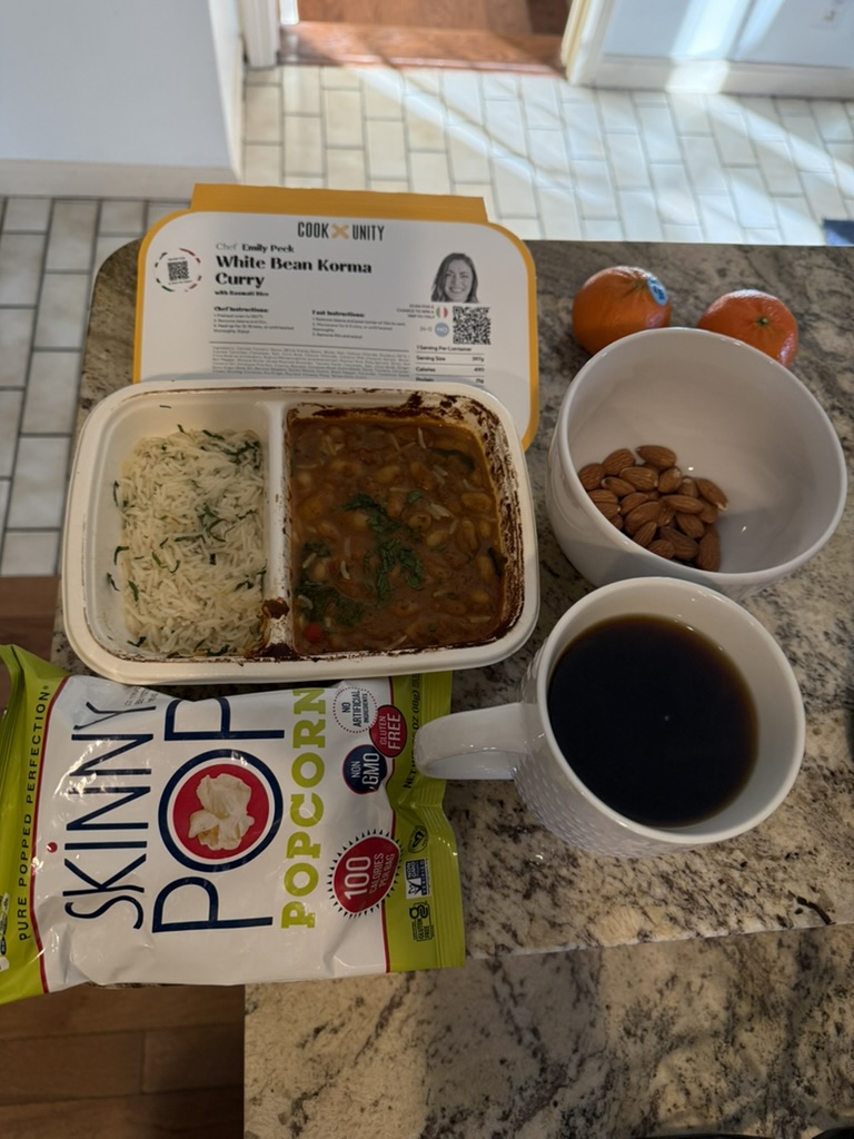 Food Day 69 February 21, 2025 Rice and beans, oranges, almonds, coffee, popcorn Chai Soylent Chicken roganjosh Frozen yogurt