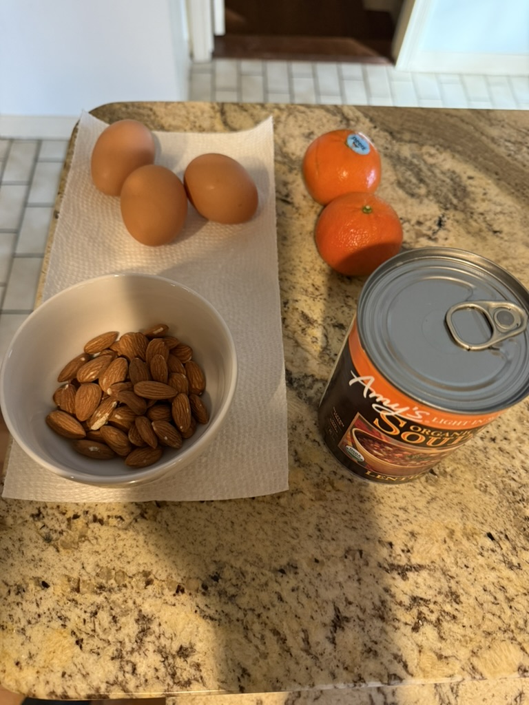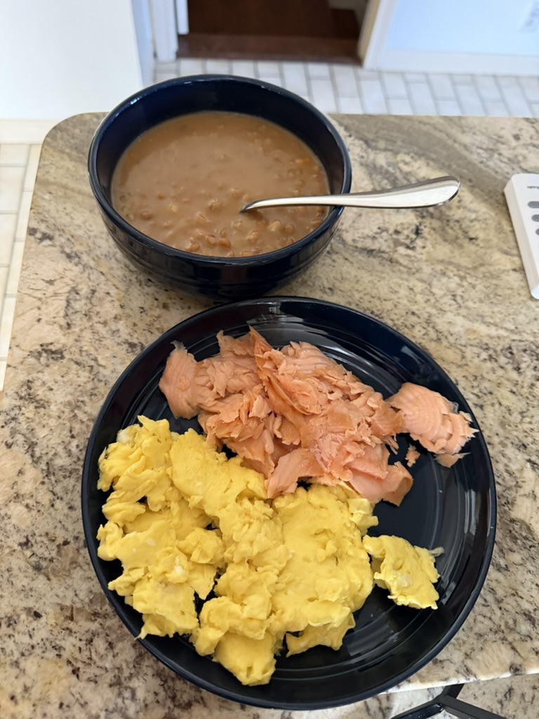 Food Day 67 February 19, 2025 Grilled thyme chicken, veggies Chai Popcorn, oranges Coffee Lentils soup, eggs, salmon Chicken quinoa bowl