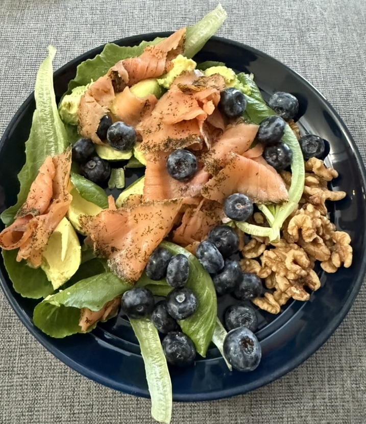 Food Day 57 February 9, 2025 Salmon, walnuts, avocado, blueberries, lettuce Chai Grilled thyme chicken Daal makhni