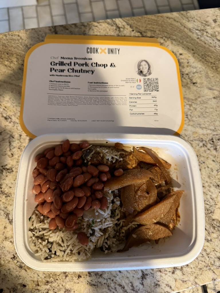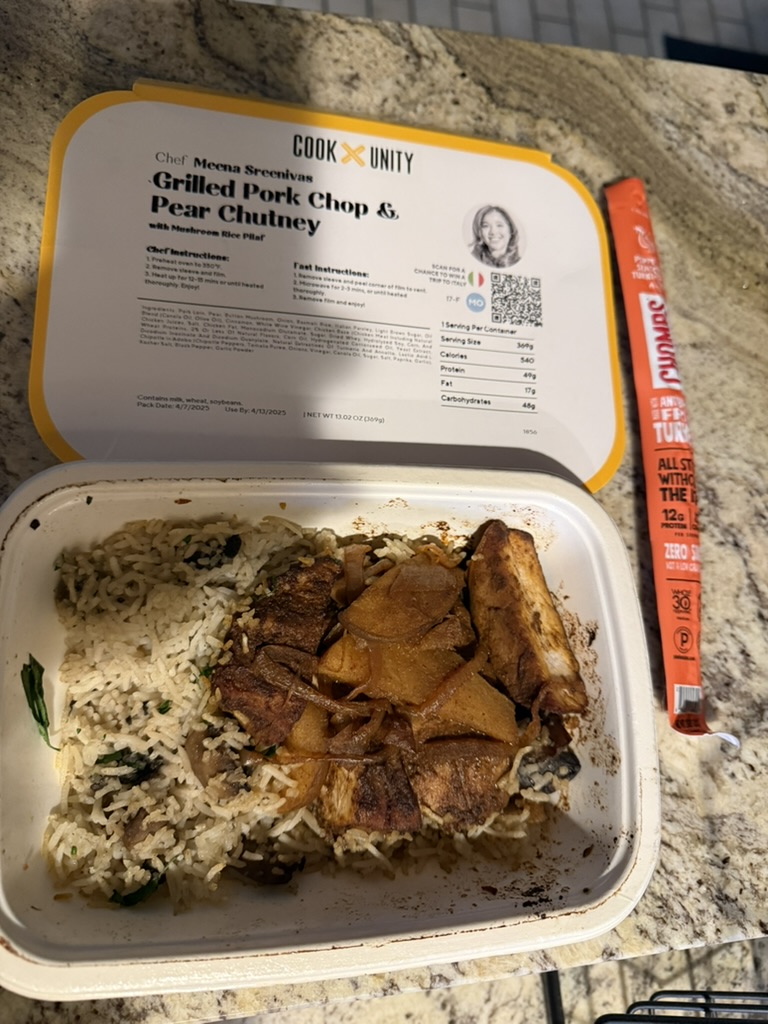 Food Day 117 April 10, 2025 Yogurt protein shake Eggs, spinach Cottage cheese, peanut butter Chai` Turkey sticks Chipotle lime salmon Pork, rice, beans, pears Yogurt protein shake