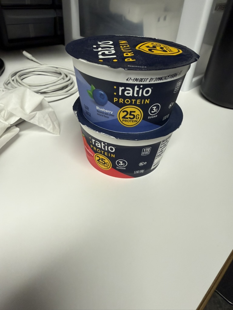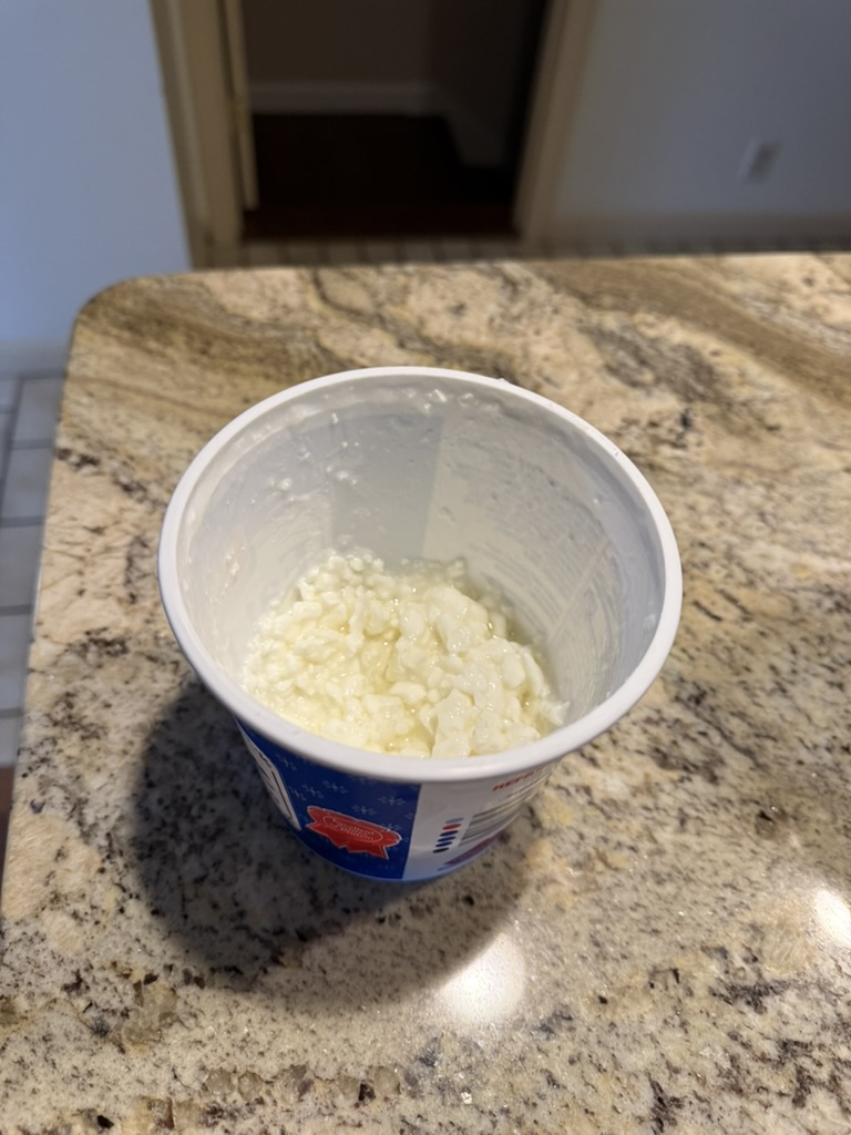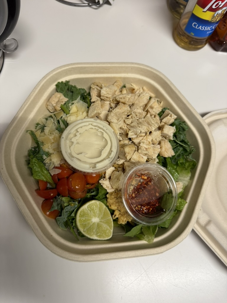 Food Day 115 April 8, 2025 Latte Protein yogurt Chicken kale bowl Almonds Rice snack Pizza (ate half) Yogurt protein shake