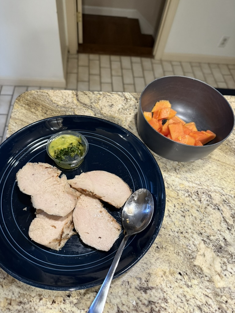 Food Day 113 April 6, 2025 Chicken, chimichurri sauce Chai Chicken, chimichurri sauce, papaya Soylent, papaya Cottage cheese Yogurt protein shake
