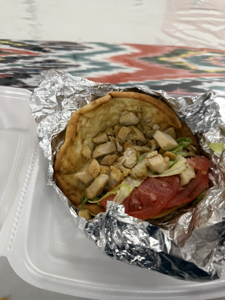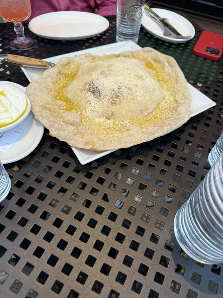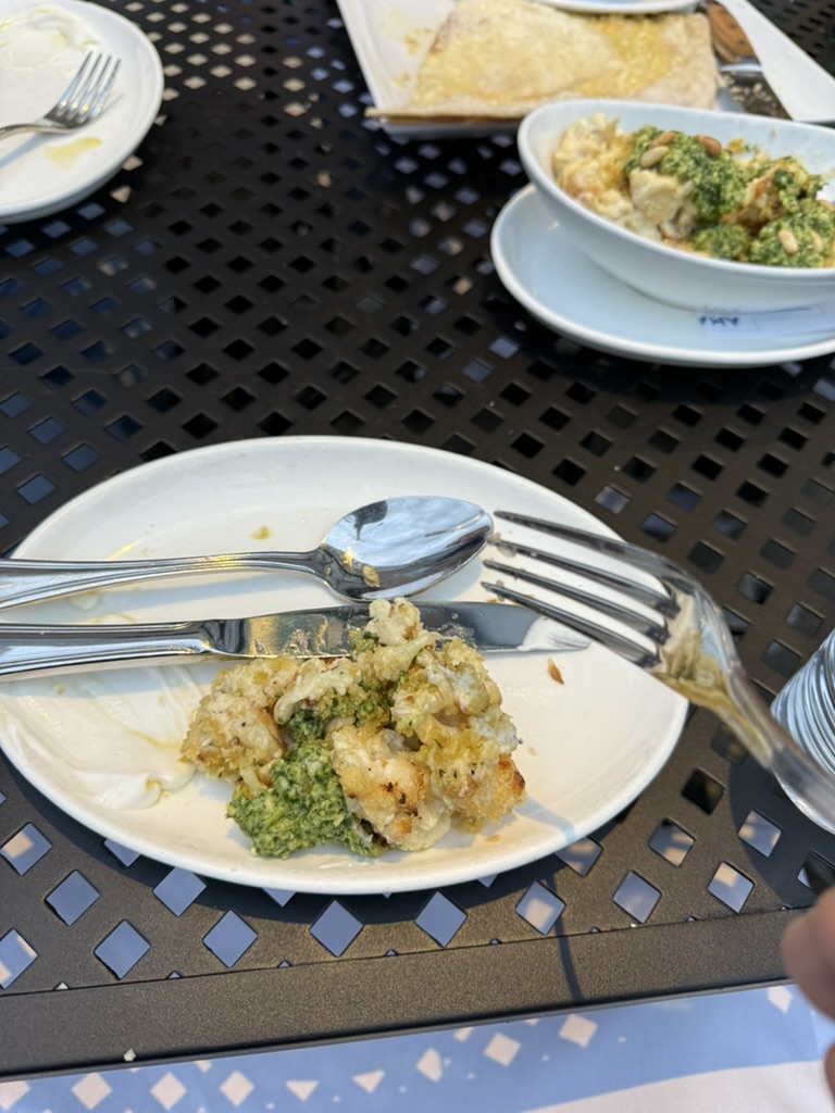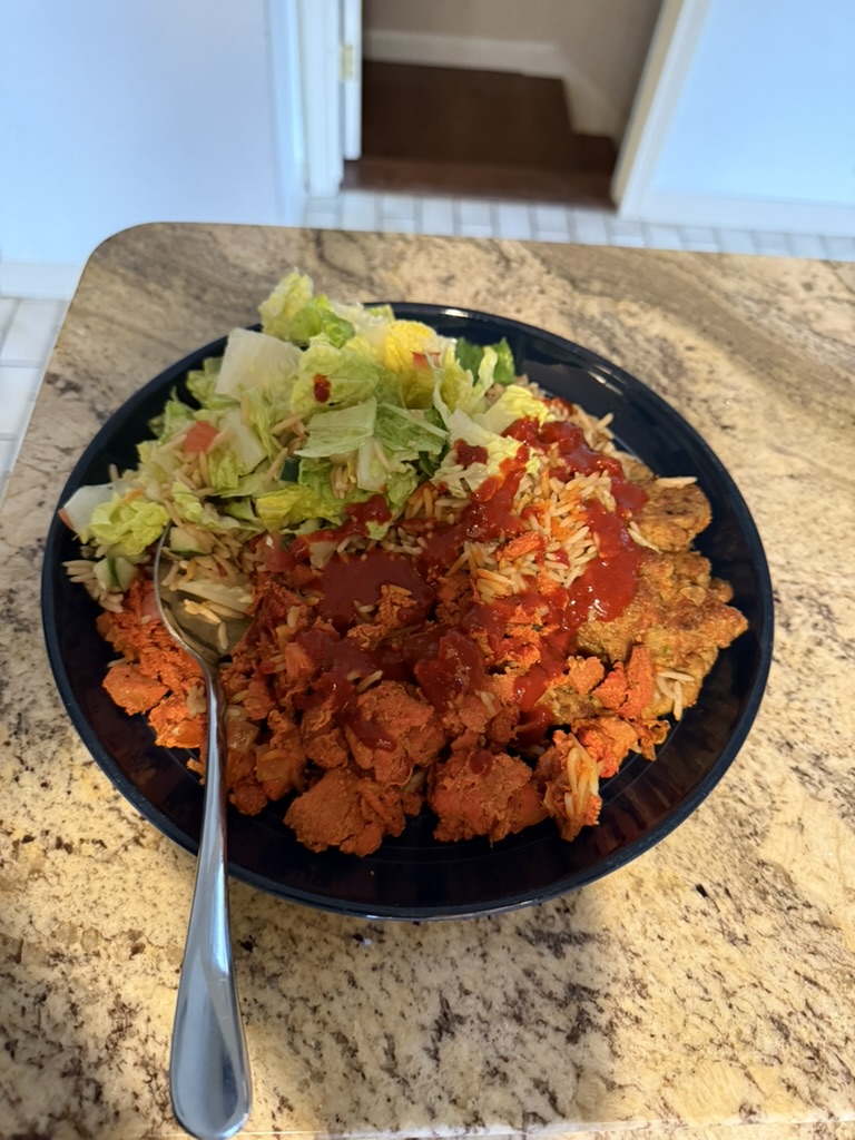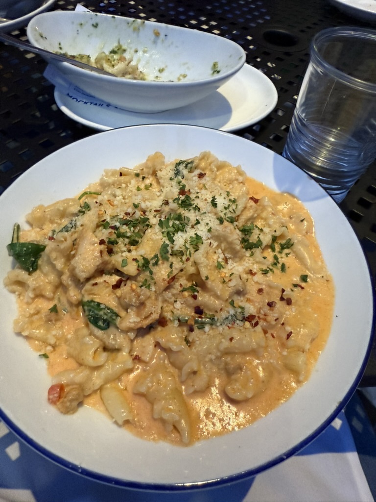 Food Day 154 May 17, 2025 Protein shake Fruit, coffee Chicken gyro Pizza Fries Bread Pistachio cauliflower Pollo piccante e campanelle Decaf latte