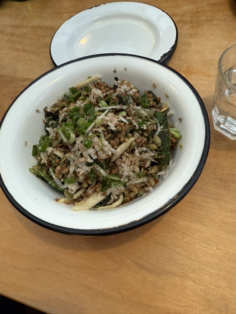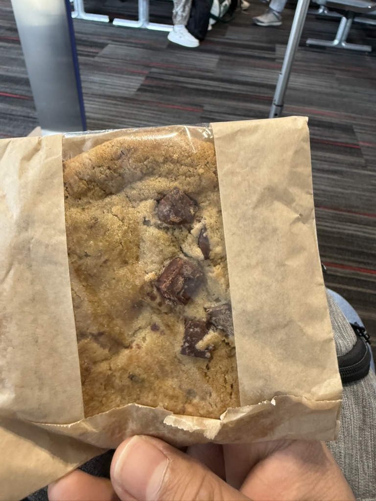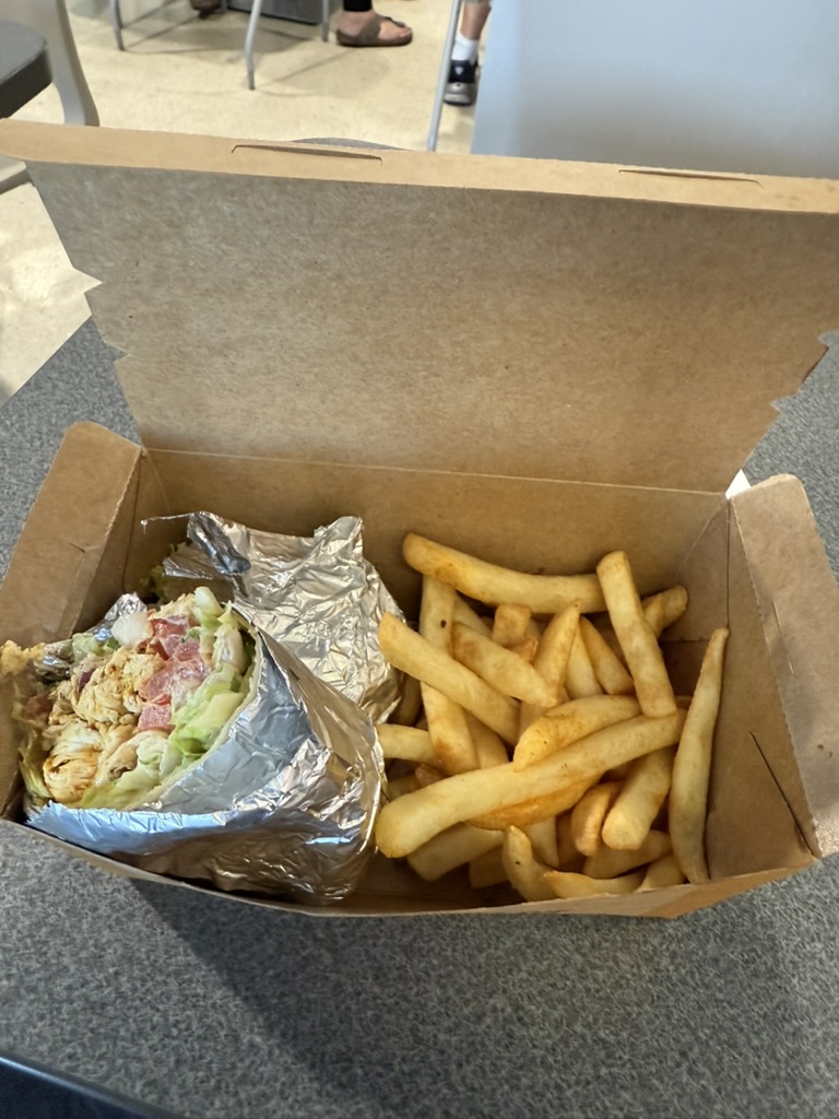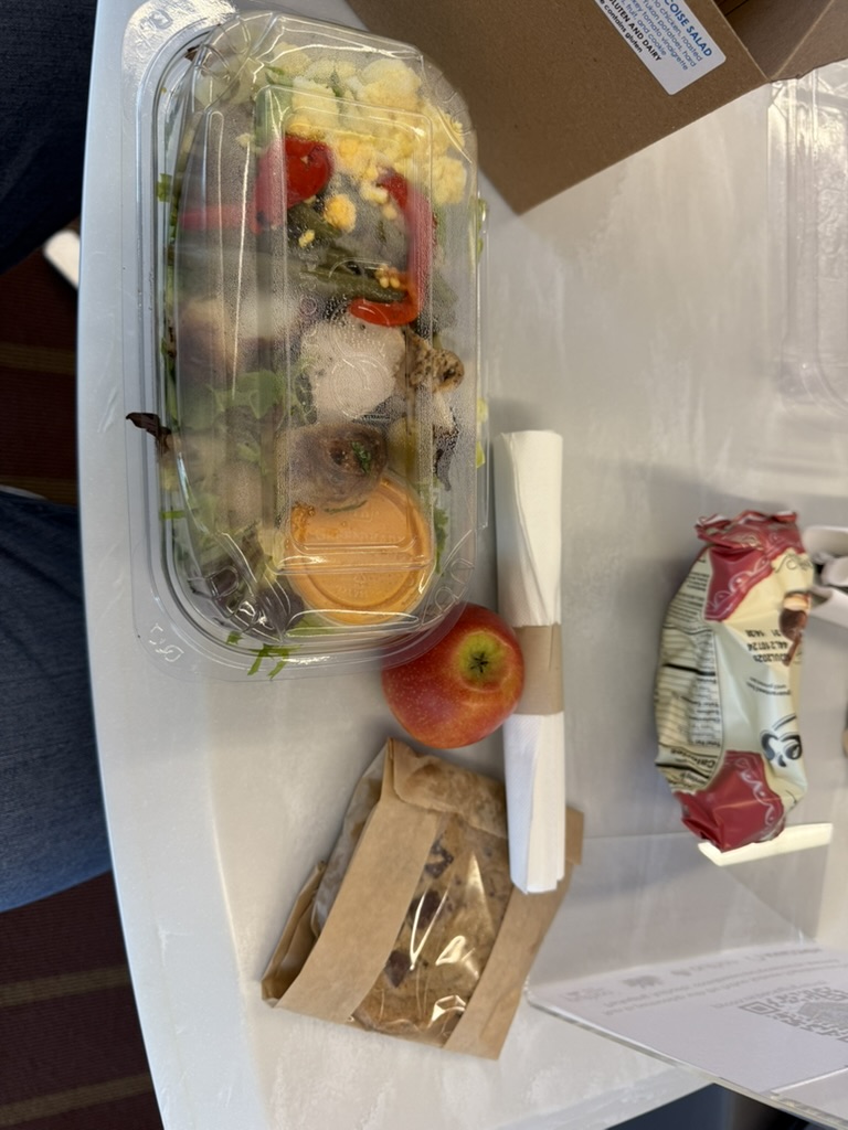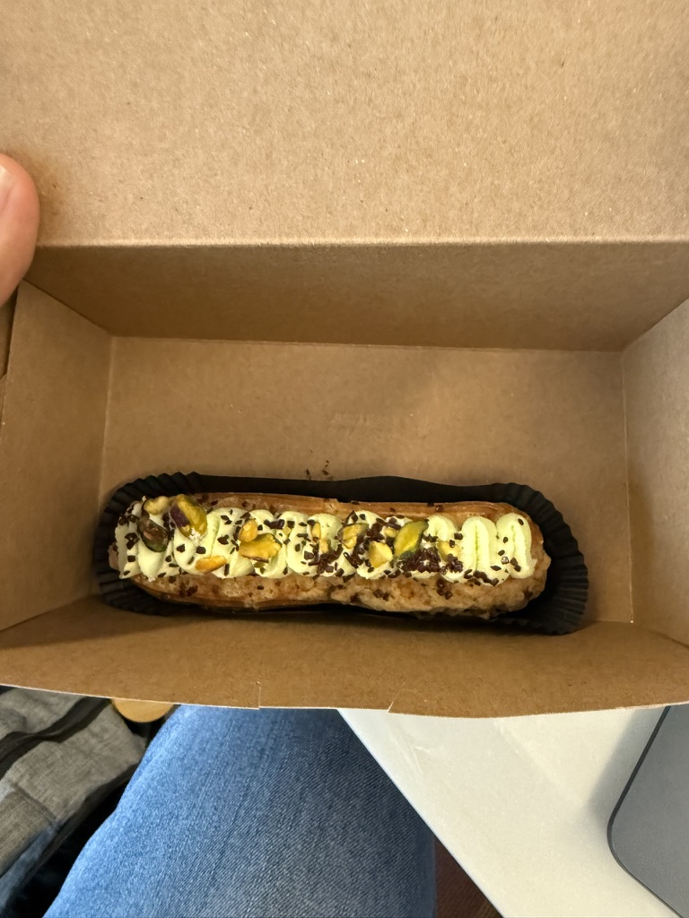 Food Gym Day 156 May 19, 2025 Gym Hotel gym without trainer. Dumbbell bench, overhead press machine, Row machine (no cable), leg press Food Delice de Pistache Rose latte Chicken salad, apple Cookie Chicken wrap, fries