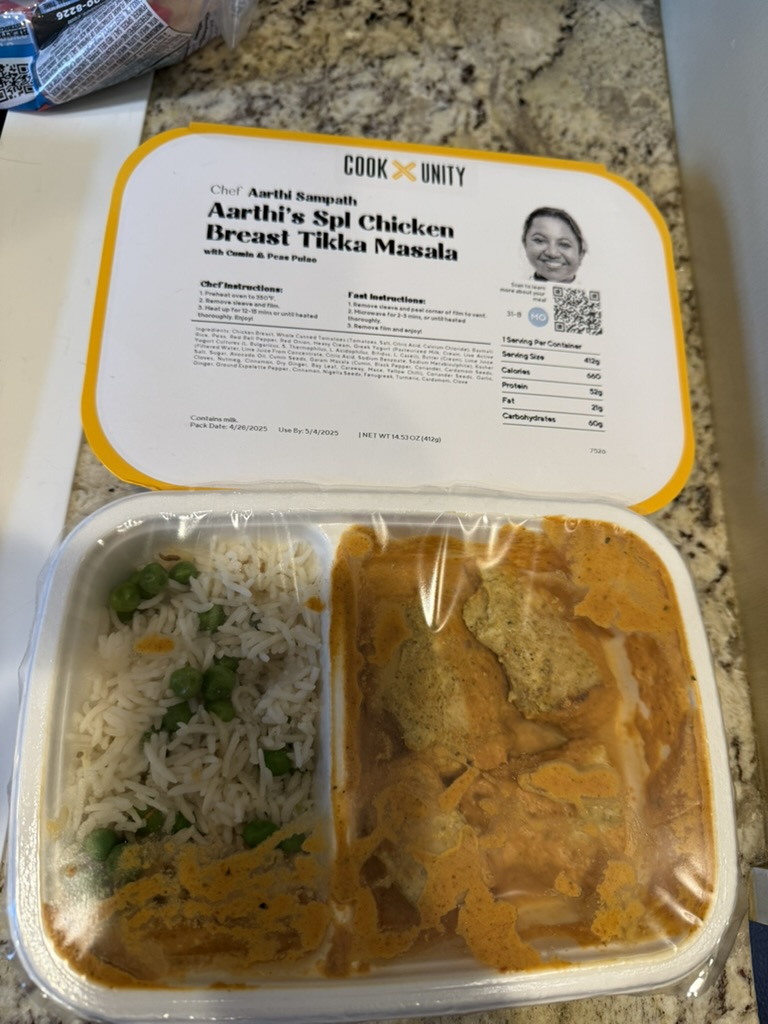 Food Weight Check Day 143 May 6, 2025 Weight: 283 lbs Chicken vindaloo, egg white patties Chai, cookies Coffee Chicken saag, breakfast pitas Beef stick Salmon, veggies Yogurt protein shake