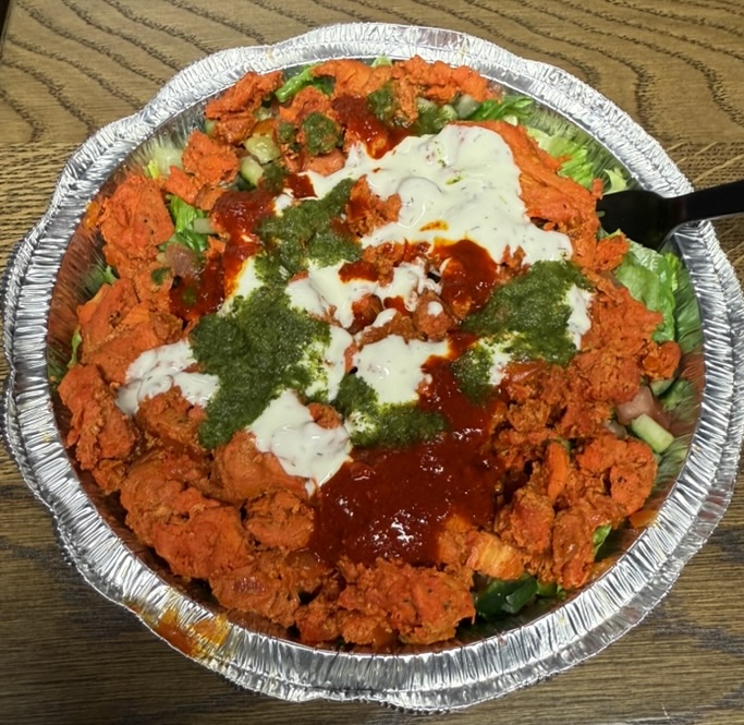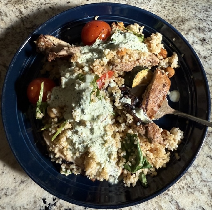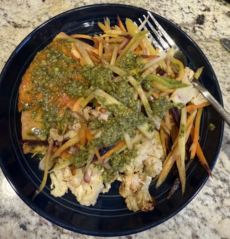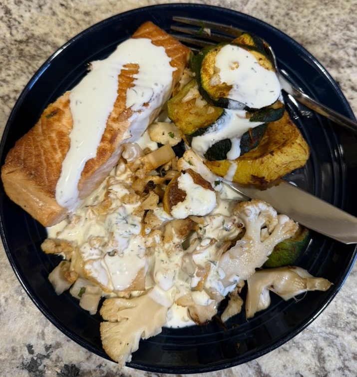 Salmon, cauliflower, zuchinni, yogurt sauce