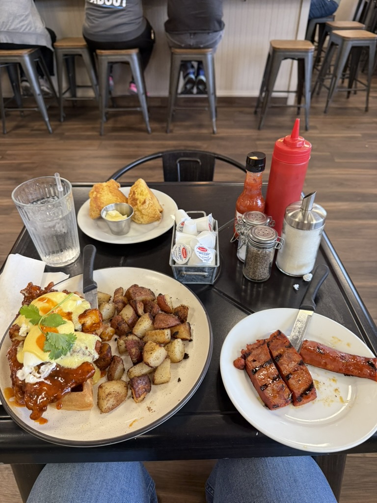 Cheat Day Food Hike Day 182 June 14, 2025 Hike Food Habanero benedict chicken waffles, corn muffin, chourico, home fries Salmon asparagus wrap, fries Crumb cake Raspberry almond cake Pizza Peanut butter chocolate brownie